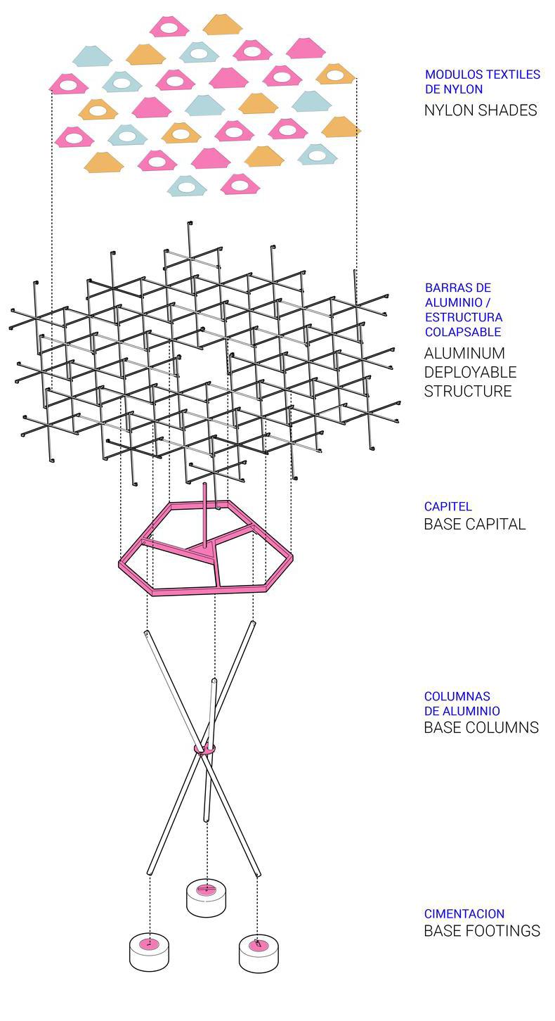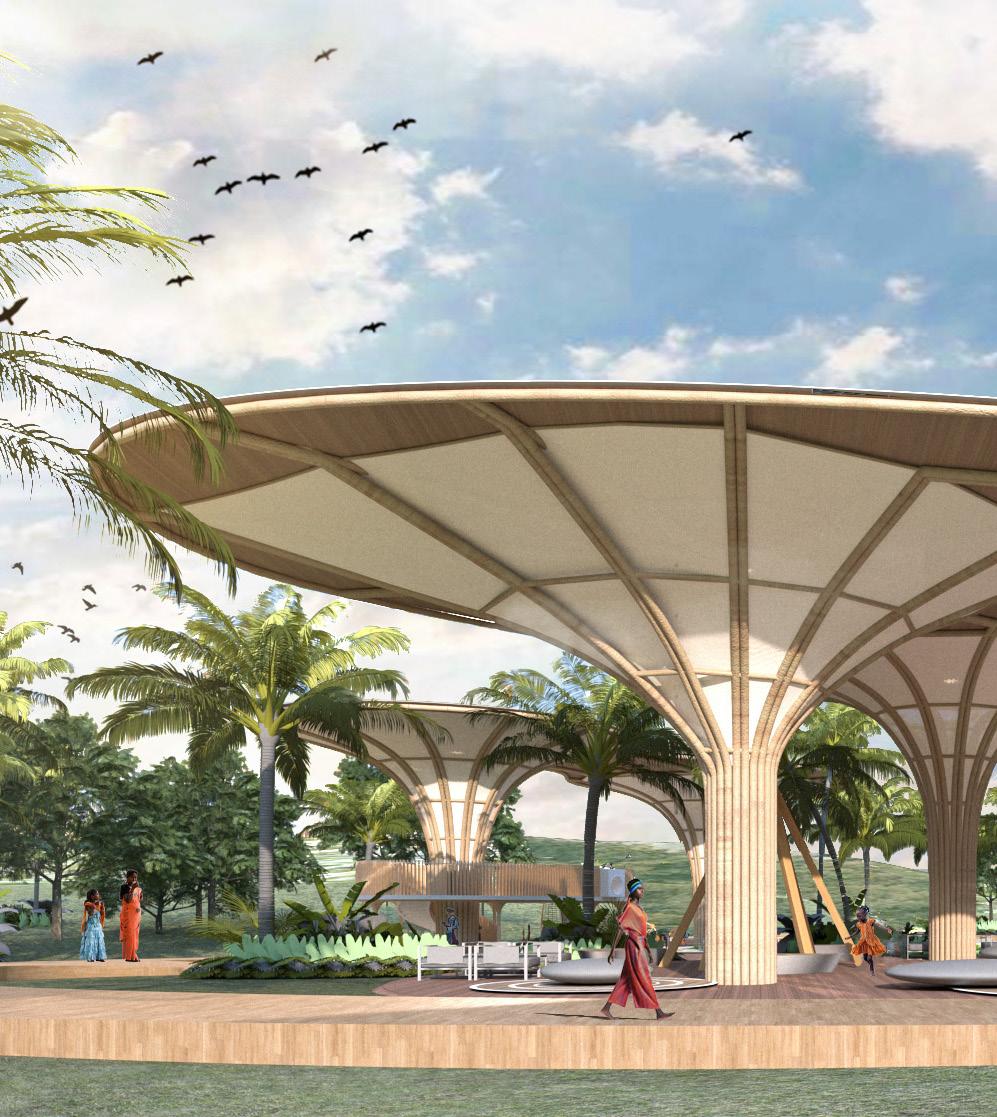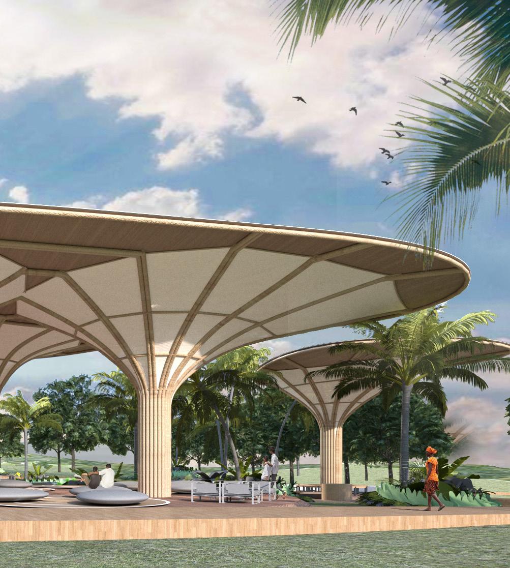 This project is to develop a design scheme for an energy and water self-sufficient island in the South Pacific. A solar farm was designed to produce electricity and water demanded by the households of the island. The solar farm consists of tree-like structures capped with solar PV panels. Beneath the solar panels, a waterproofing surface will garner rainwater to the roof drain placed at the top of the trunks of each solar tree, channeling water down through vertical piping. The design concept of this solar farm was drawn inspiration from natural forms of the local biome. The structure flares outward, maximizing its surface area to collect solar energy and rainwater. It then tapers into a thick, sturdy trunk that not only supports the canopy but also functions as a channel for directing rainfall. The solar farm will also serve as a sun-shaded and rain-protected community gathering space.