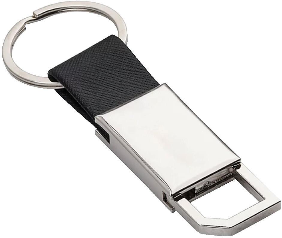 This keychain features leatherette detailing, a metal pull out/twist clip, and a metal split ring. Made of nickel. Dimensions without ring: 4.1"L x 0.865"W, 3"L x 0.86"W