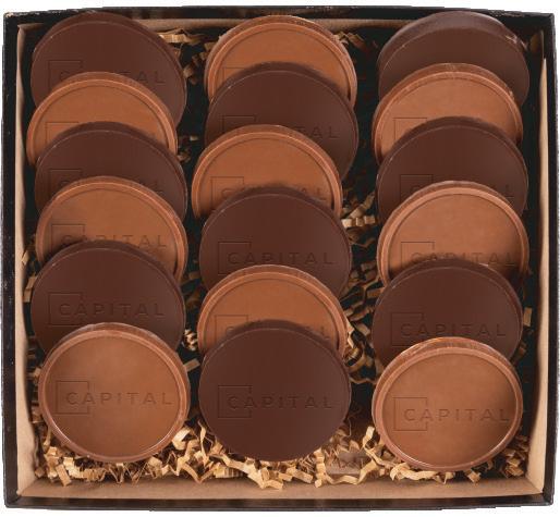 18 milk and dark chocolate cookies packaged in a gold gift box with a matching ribbon. 8" X 7" X 2"