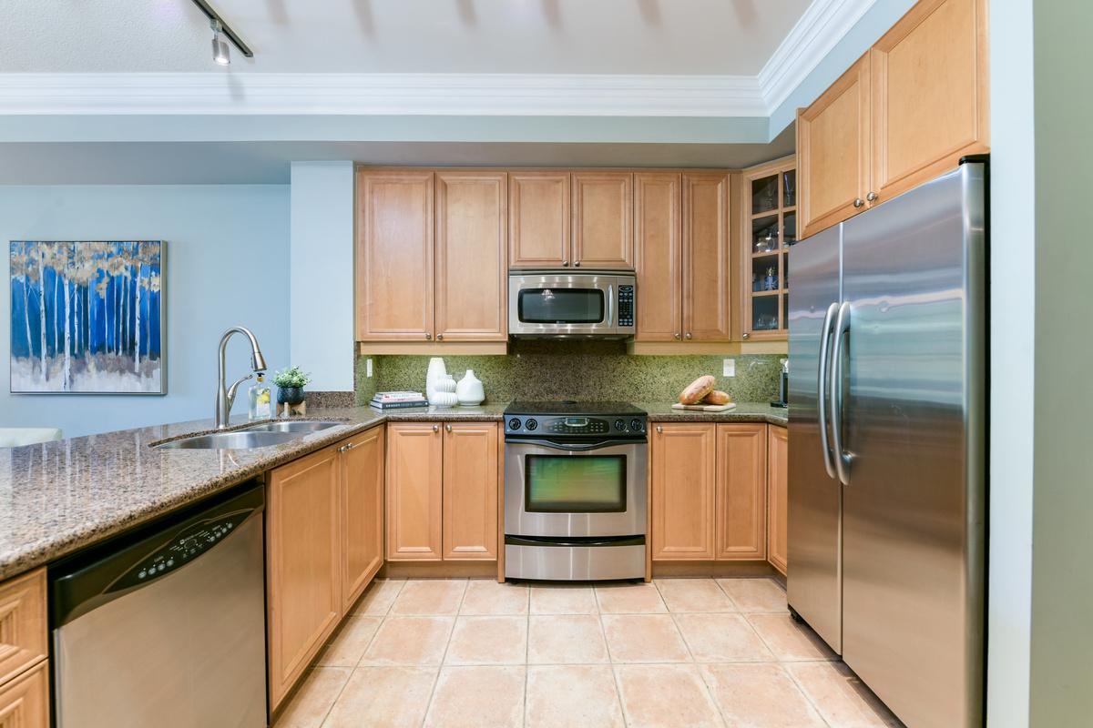 The kitchen offers stainless steel appliances, granite countertops and backsplash, under-mount stainless steel double sinks, track lighting and undermount cabinet lighting, tile floors, and access to laundry room.