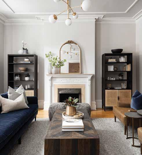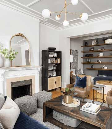 An eclectic look lets them blend the old with the new. “They wanted to highlight the architecture and millwork of the home and modernize it at the same time,” says Brock. “They also wanted to incorporate their objects from their trips and curiosities on floating shelves, but because they didn’t have a separate liv ing room on the main floor, this served