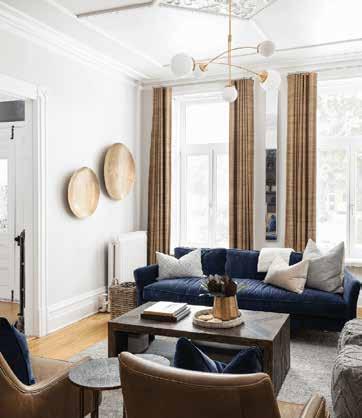 Brock describes the color palette as “earthy, moody, and completely ontrend.” “The blue-and-caramel color scheme was a challenging palette, proof that you really need to carry a colour throughout a room,” she says, noting that the contrast comes from caramel leather, camel-colored curtains, pairing brass with black, and blue furniture that stands out against the white walls. “All these details contribute to letting the architecture shine, includ ing that beautiful mantel and fireplace.”