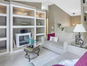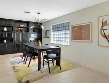 These architectural features comple ment the well-curated contents, like the leather accent chairs that bring comfort and old-world charm. The coffee table leans more rustic with an imperfect surface, while the accent tables have a shagreen finish that is perfect for beverages. A pair of boho-chic poufs complement black bookshelves with caning on the doors.