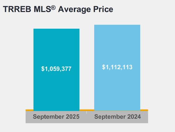 The MLS® Home Price Index (MLS® HPI) Composite benchmark was down by 5.5 per cent year-over-year in September 2025. The average selling price, at $1,059,377, was also down by 4.7 per cent compared to September 2024.