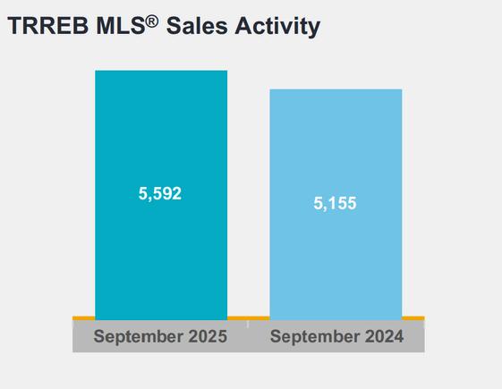 GTA REALTORS® reported 5,592 home sales through TRREB’s MLS® System in September 2025 – up by 8.5 per cent compared to September 2024. New listings entered into the MLS® System amounted to 19,260 – up by four per cent year-over-year.