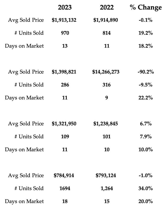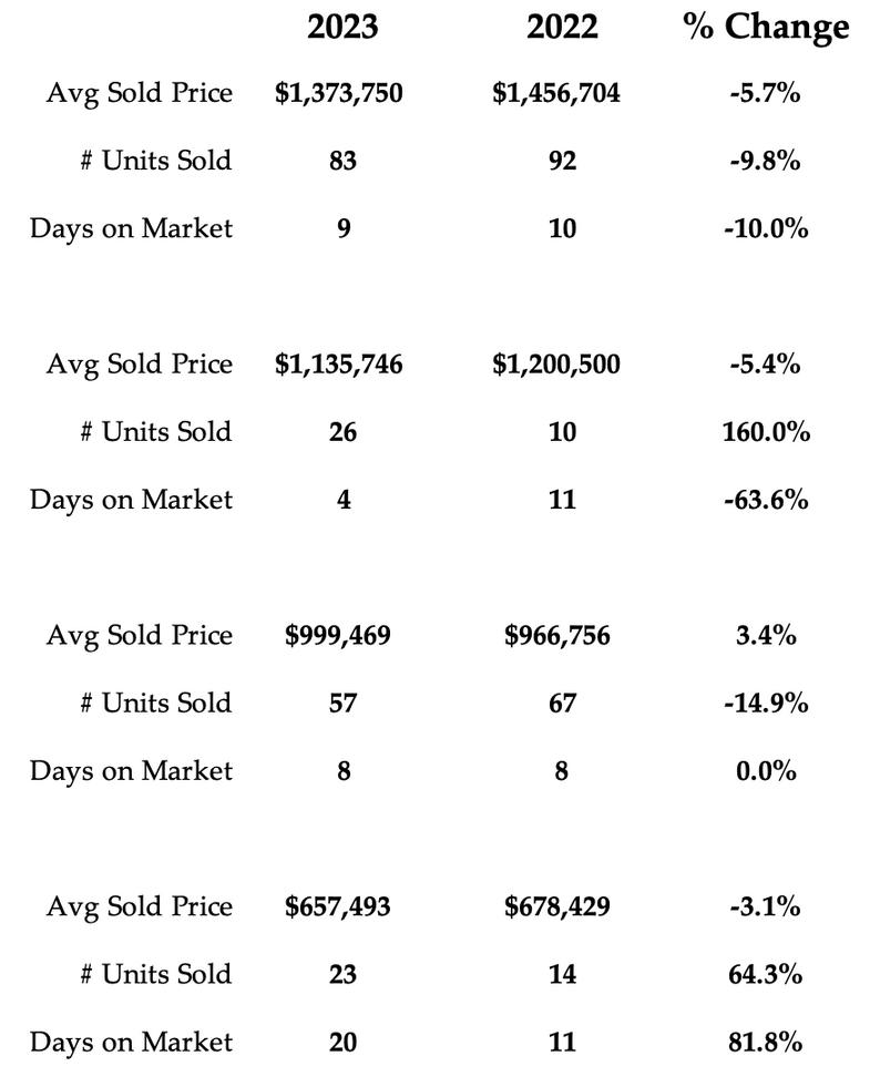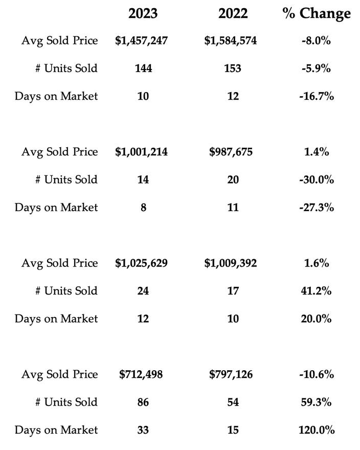 2023 2022 % CHANGE SALES 9,012 7,226 24.7% NEW LISTINGS 15,194 18,687 -18.7% ACTIVE LISTINGS 11,868 15,430 -23.1% AVERAGE PRICE $1,196,101 $1,210,372 -1.2% AVG DAYS ON MARKET 20 18 11.1% 416 905 416 905 Detached YoY % Change 970 20.3% 3,079 22.2% $1,913,132 0.0% $1,556,566 0.6% Semi-Detached YoY % Change 286 -8.9% 501 15.7% $1,398,821 -2.0% $1,198,185 -0.5% Townhouse YoY % Change 307 15.8% 1,217 24.3% $1,068,4871 1.8% $1,003,152 2.5% Condo Apt YoY % Change 1,694 34.3% 874 49.9% $784,914 -1.1% $748,483 -3.0%