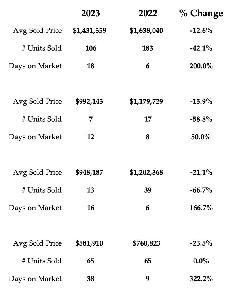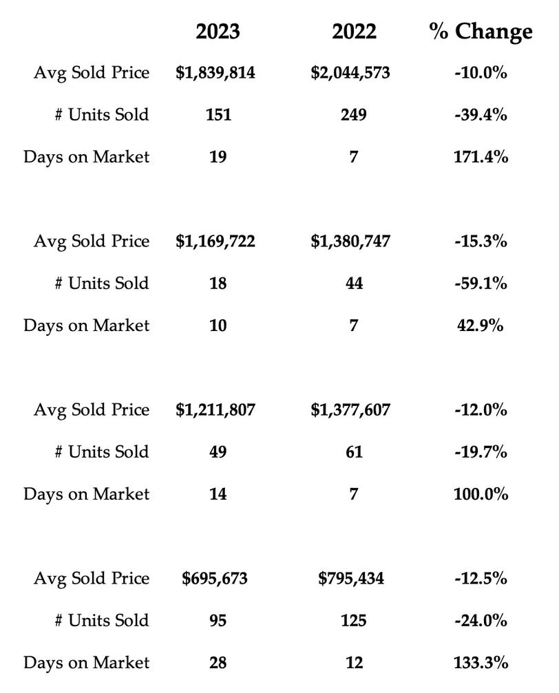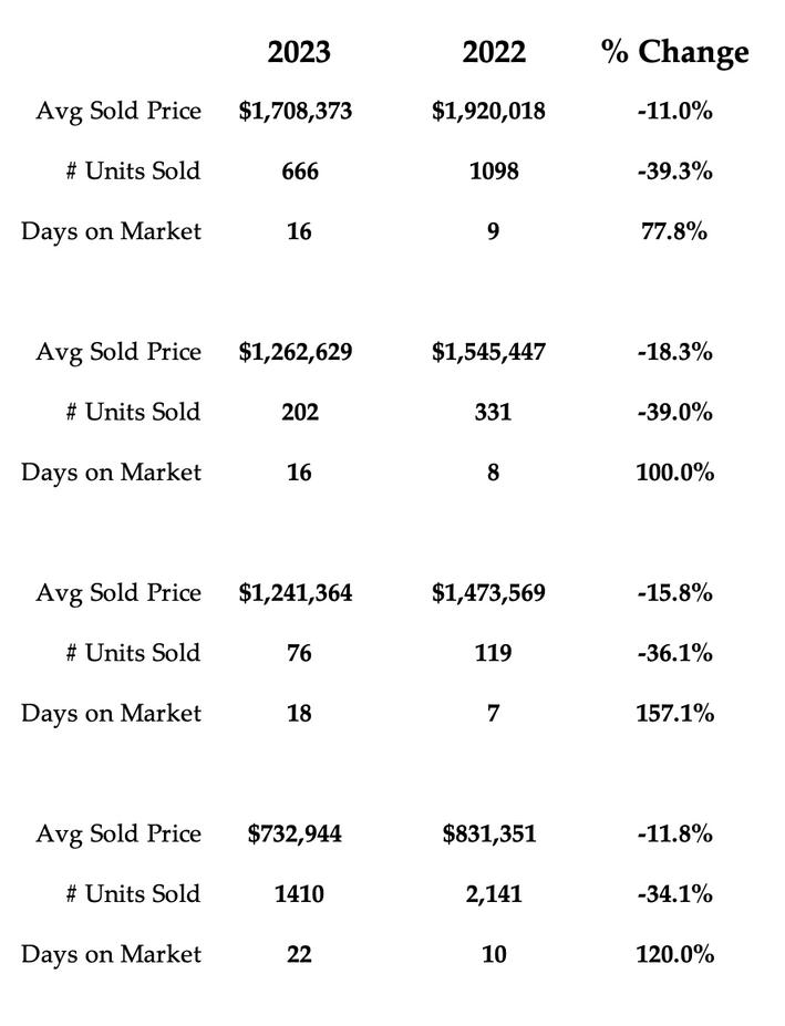 2023 2022 % CHANGE SALES 6,896 10,862 -36.5% NEW LISTINGS 11,184 20,061 -44.3% ACTIVE LISTINGS 10,120 10,157 -0.4% AVERAGE PRICE $1,108,606 $1,298,666 -14.6% AVG DAYS ON MARKET 27 11 145.5% 416 905 416 905 Detached YoY % Change 666 -38.7% 2,334 -37.6% $1,708,373 -10.8% $1,400,246 -14.3% Semi-Detached YoY % Change 202 -39.0% 354 -45.4% $1,262,629 -18.3% $988,233 -17.6% Townhouse YoY % Change 230 -40.1% 937 -35.0% $973,878 -12.9% $926,237 -14.2% Condo Apt YoY % Change 1,410 -33.8% 711 -29.7% $732,944 -11.9% $645,305 -15.1%