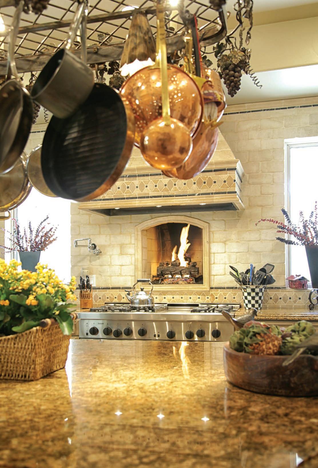 The kitchen is Susan’s favorite room in the house and it serves a very specific purpose. The space contains unique features such as a functional fireplace directly behind the stove. The kitchen is also home to a massive iron pot rack, one of the very first pieces that the homeowners included in their home. It was important that the kitchen be a central point with visual access to the rest of the home. “It is my favorite because it’s open to the family room and when raising three boys, it was important that I could always be in contact with the family.”