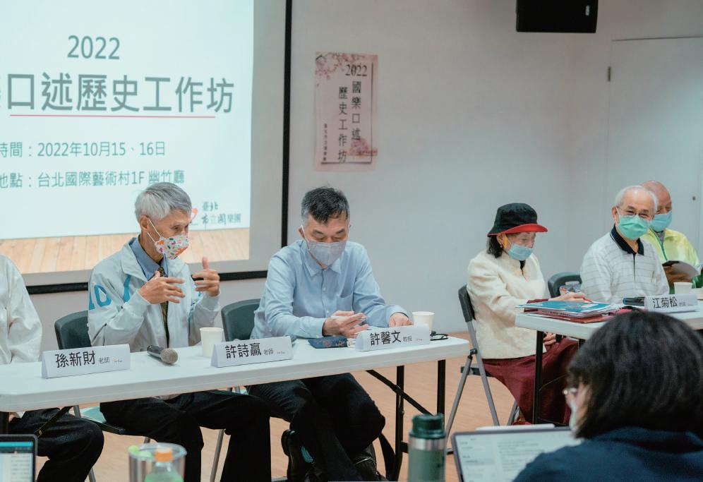 北市國於 2022 年 10 月 15-16 日(六、日),在臺北國際藝術村幽竹廳舉辦口述歷史工作坊,理論與實務並進,除了專 家學者的經驗分享外,更安排數位《新絲路》受訪過的國樂前輩,分享國樂與其生命密不可分的關係。陳鄭港介紹, 2022 年 9 月 30 前公開招生,全國大學音樂學系、音樂研究所碩博士在學學生或對國樂口述歷史有興趣的各界人士皆歡 迎報名。 工作坊的第一天,學員約近 30 人幾乎全員到齊,上午講座一:許雪姬老師「講題:臺灣口述歷史的回顧與展望」;下午二 堂課程,講座二:張美鳳老師「講題:口述歷史教會我的事」、講座三:林月里老師「講題:五零年代臺灣國樂的發展幼 獅國樂社的影響與貢獻」,每位老師不藏私地分享口述歷史的價值與發展,而學員亦汲汲吸取老師談歷史的養份,為了第 二天的實務工作坊所準備,然而萬萬沒想到,第二天天氣驟變,狂風急雨一整天,學員人數也因此受到影響,但上午課程 仍依計劃進行,講座三:沈冬老師「講題:尋聲暗問彈者誰?― 近現代音樂史研究方法論:以周藍萍研究為例」,下午的 實務工作坊原預計分組訪談許輪乾、陳勝田、江菊松、許詩贏等老師,但因參加人數不足,所以改為「耆老座談會」, 藉由國樂耆老口述分享,讓學員一一進行記錄與統整,並藉此看見臺灣國樂發展歷程。 為期兩天的口述歷史工作坊,不僅有多位一線口述歷史學者與工作者分享口述歷史的工作與執行方法,更有
