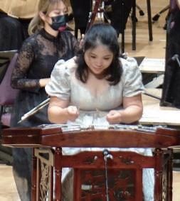 而第二揚琴協奏曲《和》則是由廖紫伶所演繹,亦為本場音樂會中曲目篇幅最長之樂曲,曲中分別選取 7 個地區的民歌,每 一個部份皆由樂團中不同聲部輪流與揚琴對話,透過作曲家將其貫穿、銜接,完整地表達其「和」的概念。也因此,不論是 隨彈奏器具的多樣改變彈琴習慣,抑或是對於不同民族的民歌小調之詮釋,都在在考驗著演奏者於演奏時長時間的專注。