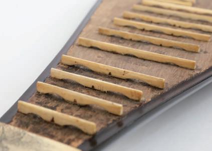 為民初紫韻樂會如意式蝙蝠頭琵琶,以琴頭上鑲嵌圓形象牙為特色,為四相十二品型制琵琶,其相、品、天牌、地牌與覆手均為象牙材質,尤以空心品 為特色,為一片式面板,現代琵琶多是拼板式面板。 左:清代琵琶琴頸。右:現代琵琶琴頸。 傳統琵琶僅有四相,今一相與六相的位置原貼有「天牌」與「地 牌」,上頭多有雕刻圖樣或字樣,有時各自表述,有時上下呼應合 為一圖,琵琶工藝之精妙也由此可見。 地牌 天牌