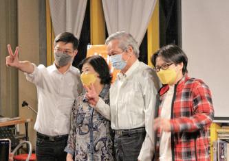 左: 2015 年 11 月 29 日����銅國樂團定期音樂會《幸福的花朵為你開》。(宜蘭縣����銅國樂團提供)。中:黃文亮全家福照片,左起黃奎翰、黃師母、黃文亮 老師及女兒黃郁棠。右: 2022 年 11 月 29 日與黃文亮老師及黃師母攝於「好風如水」(攝影/ 吳昌儒 )。 41 由於宜中、宜商、光復國小國樂比賽成績耀眼,獲得宜蘭縣政府教育處的重視,開始編列預算補助,最多時曾一校一 年 30 萬元。由於宜商是國立學校,補助無門,於是我爭取向宜蘭縣長游錫 堃挹注經費,辦理「歌仔戲薪傳計