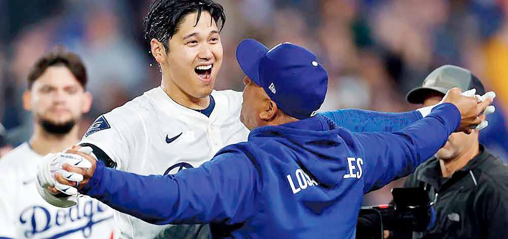 Shohei Ohtani celebrates after blasting a solo walk-off home run to give the Los Angeles Dodgers a 6-5 win over the Atlanta Braves
