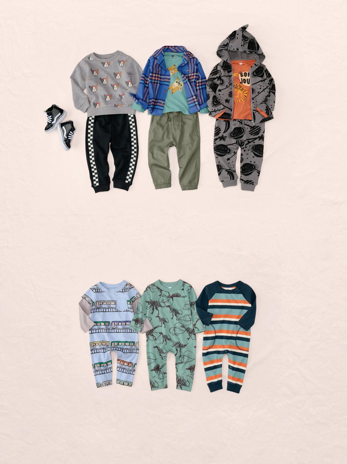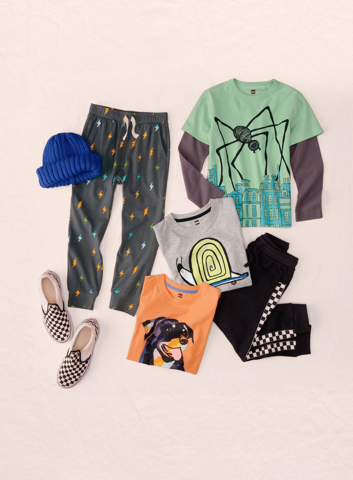 SHOP ALL OF OUR SETS AND SAVE AT TEACOLLECTION.COM/SETS 12 A. On the Go Escargot Graphic Tee $29 23F22125 3–6M thru 12 B. Stripe-Out Joggers $39 23F22202 2–16 C. Bon Chien Graphic Tee $29 23F22130 2–16 D. Spider Layer Sleeve Graphic Tee $35 23F22133 2–16 E. Stretchy Everyday Joggers $35 23F22215 3–6M thru 16 all items shown are imported A, B B, D B, C A, E D, E C, E