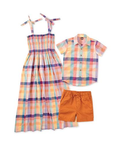 2 A. Plaid Button Up Woven Shirt 23S23103 2–16 $39 B. Twill Sport Shorts 23S23204 2–12 $35 C. Adult Tie Shoulder Smocked Dress 23S93302 XS thru XL $139 D. Woven Wrap Dress 23S13301 2–16 $55 all items shown are imported