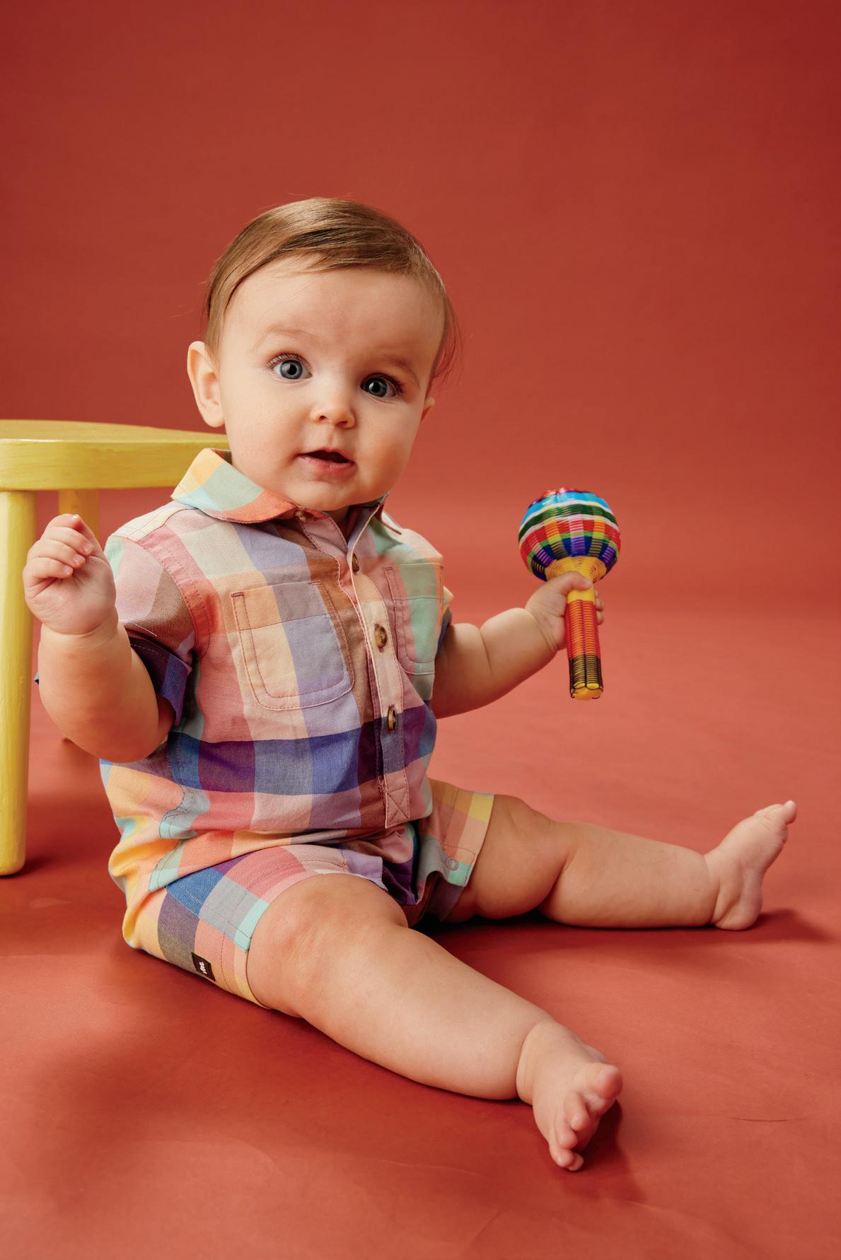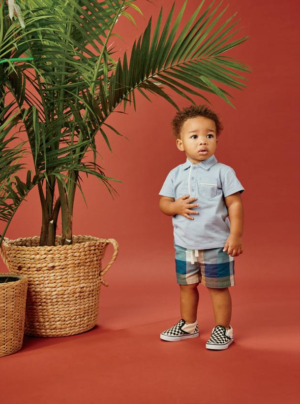 28 A. Plaid Buttoned Baby Romper 23S43502 0–3M thru 18–24M $45 B. Buttoned Baby Romper 23S43501 0–3M thru 18–24M $45 C. Piped Baby Polo 23S42114 3–6M thru 4T $29 D. Baby Plaid Discovery Shorts 23S43200 3–6M thru 4T $39 E. Plaid Button Up Woven Baby Shirt 23S43100 3–6M thru 4T $39 F. Baby Chambray Discovery Shorts 23S43201 3–6M thru 4T $35 G. Polo Baby Romper 23S42500 0–3M thru 18–24M $39 all items shown are imported A ¡Qué padre! Dress them up and take them anywhere in rompers and separates that look put together and feel comfy.