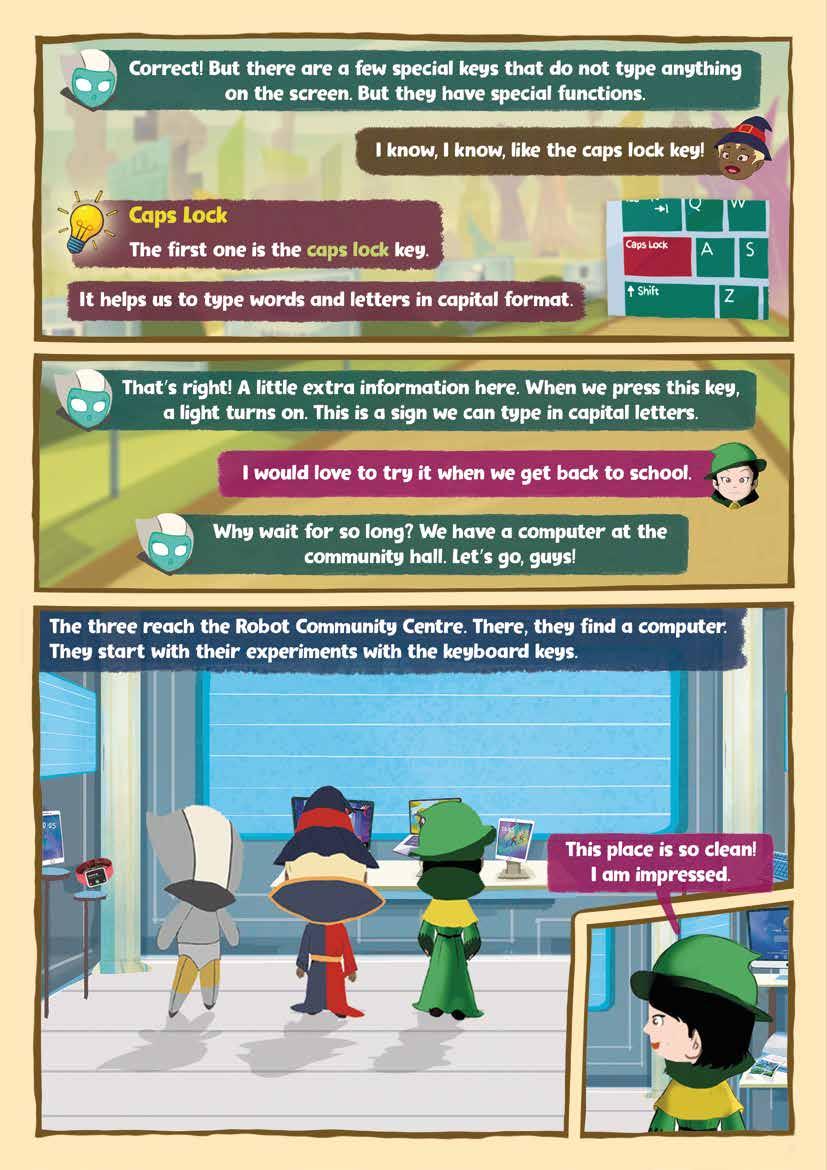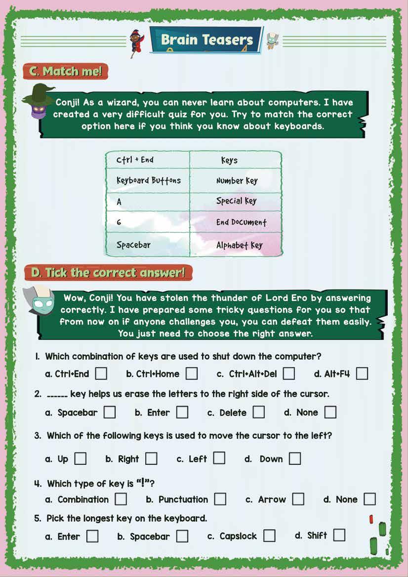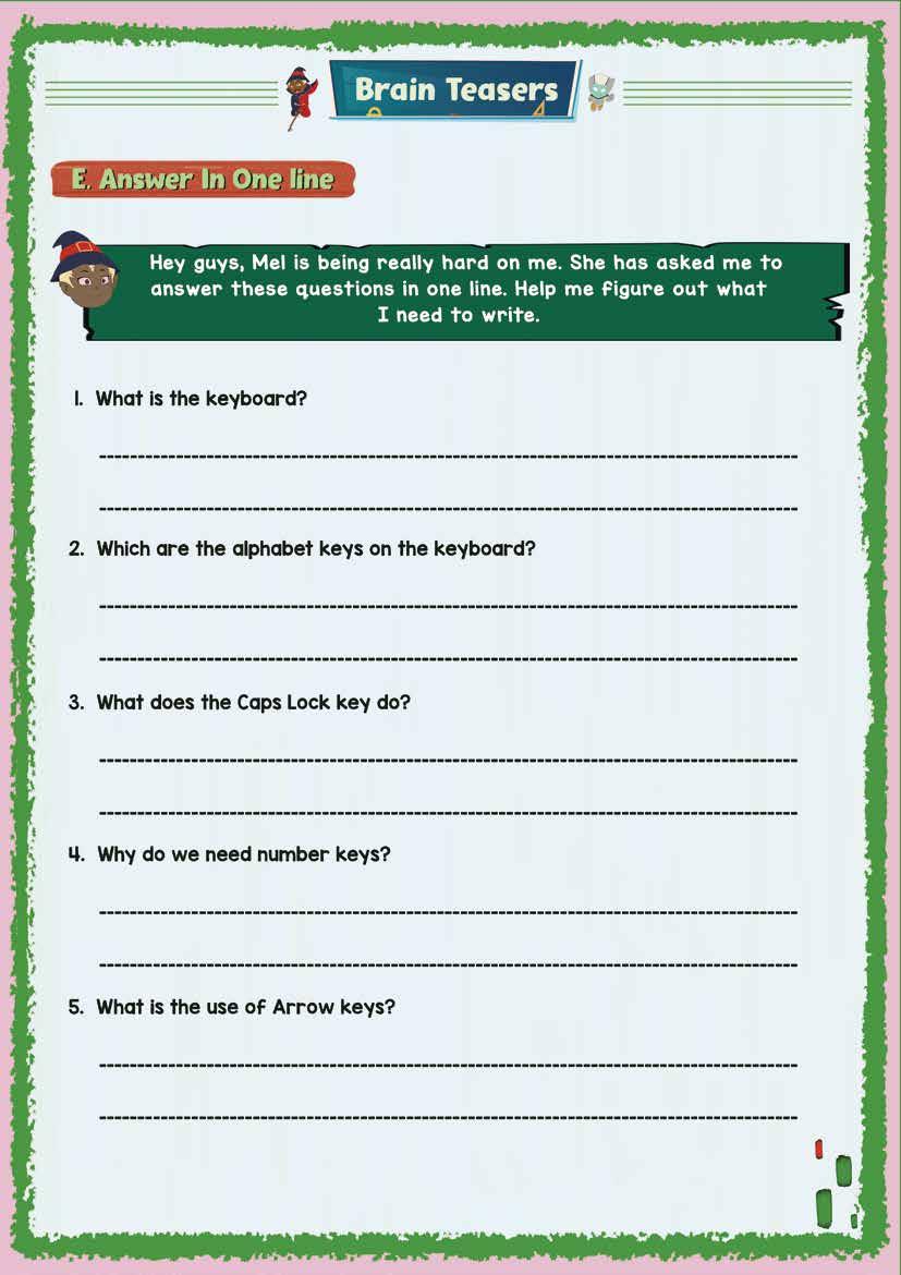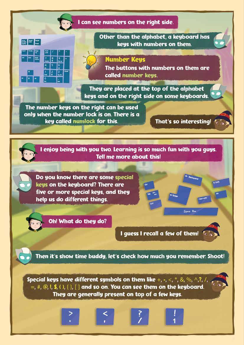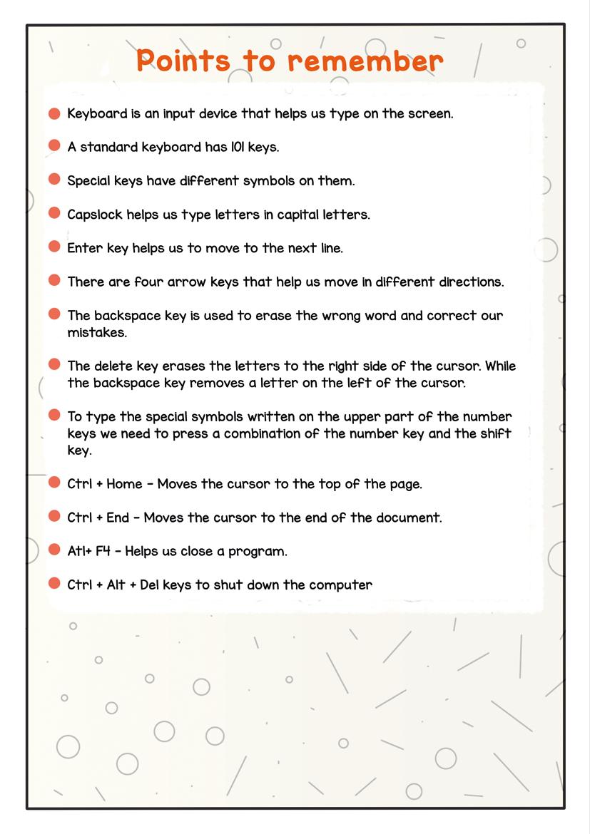 - Keyboard - an input device - Alphabet keys and number keys - Uses of special keys - caps lock, num lock, enter, space bar, arrow keys, delete, and shift keys - Combination keys