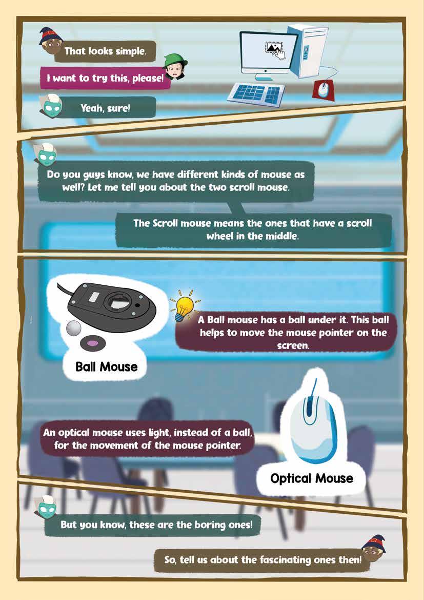 - Mouse - an input device - Button of a mouse and their uses - Drag and drop - Types of mouse - ball mouse, optical mouse, gaming mouse