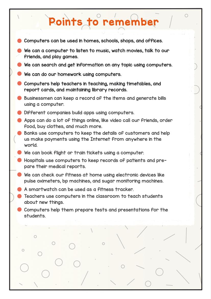 - General uses of a computer - Uses of a computer in various fields school, bank, and hospitals - Fitness appliances and Smartwatches