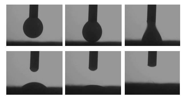 Figur 4: Interaktion af en dråbe REEF-2 coating med et termoformet bleget softwood Kraft (NBSK) fibersubstrat. Dråben blev dispenseret fra en sprøjte, og interaktionen blev optaget på video ved hjælp af udstyr til at måle kontaktvinkel under monokromatisk rødt lys. Fra venstre mod højre og top til bund kommer dråben i kontakt med overfladen i det andet billede og overføres til substratet i det tredje billede. Gennemtrængningen sker hurtigt. I det sidste billede er coatingvæsken blevet absorberet, hvilket får en fiber til at løsne sig fra overfladen. Hele processen udfolder sig på mindre end to sekunder.