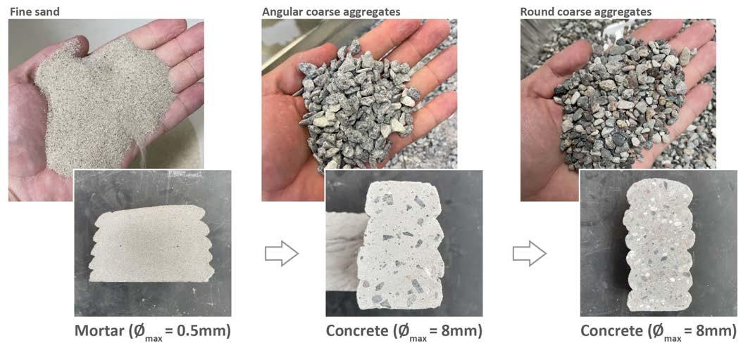 Most pump systems suitable for 3D concrete printing are not designed to handle aggregates larger than 8-10 mm. For this reason, the maximum grain size in the developed concrete often must be reduced. Both size, quantity and shape of aggregates can lead to blockage of the pump system. The rule of thumb suggests less, smaller and rounded aggregates to ensure good pumpability and to create less friction in the hose and wear of the pump.