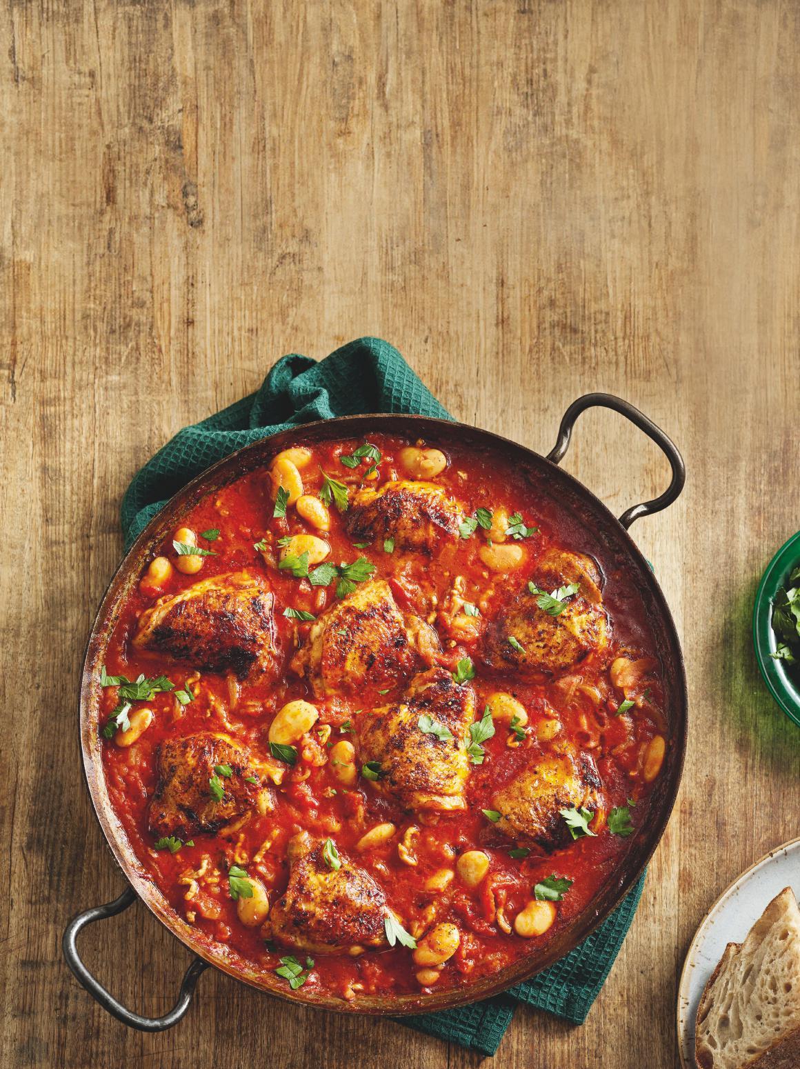 4 Go in with the butter beans, juice and all, and both tins of tomatoes, breaking them up with your spoon. Swirl a little water around each tin and pour into the pan; season with salt and pepper and stir well. Return the chicken to the pan, skin-side up, along with any juices from the plate.