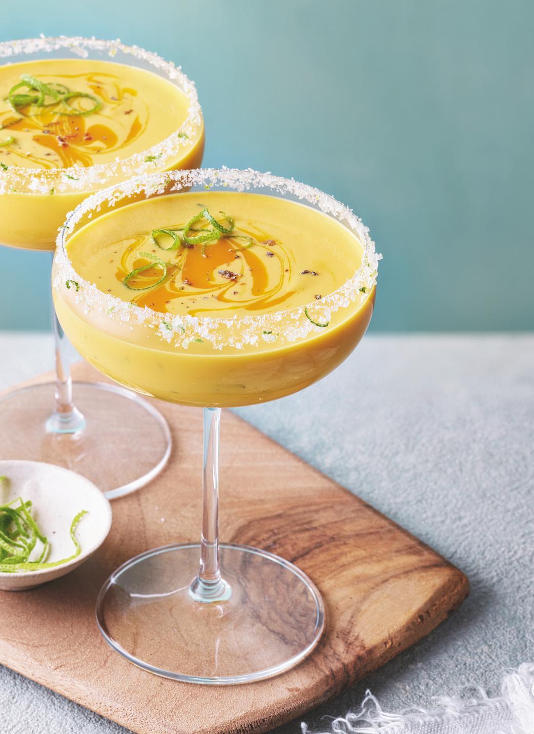 Mix 380g 0% fat natural yogurt, 180g tinned mango pulp, 2 large pinches flaked sea salt and the zest and juice of 1 lime in a jug with 120ml water. Mix 1 tbsp caster sugar with 1 tbsp faked sea salt and add the zest of 1 lime; tip onto a plate. Rub the rims of 4 glasses with the cut-side of a lime, then dip into the salt mix to coat. Divide the lassi between them. Swirl an extra tbsp of mango purée through each, then sprinkle over the crushed seeds of 2 cardamom pods. Garnish with extra curls of lime zest, if you like. Each drink contains
