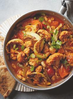 3 Add the pasta sauce, beans, stock and sugar. Simmer for 10-15 mins, then stir in the veg. Simmer for 8-10 mins until the sauce has thickened. Scatter with parsley and spring onions; serve with pittas.