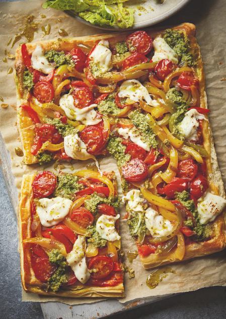 3 Press down the pastry inside the puffed up border. Spread the tomato sauce within the pastry border, then scatter over the peppers and onion. Top with the mozzarella, tomatoes and dot with the remaining pesto. Bake for 15-18 mins until browned.