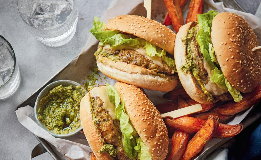 3 Add the halved burger buns to a baking sheet and put in the oven for the last 2 mins of the cooking time. Spread the bun bases with the remaining pesto, top with the burgers and some lettuce leaves, then add the bun lids. Serve with the sweet potato wedges and any remaining lettuce alongside.