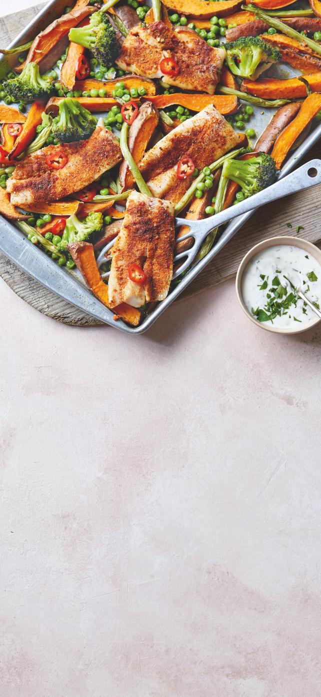 Piri-piri fish, sweet potato & broccoli traybake 53