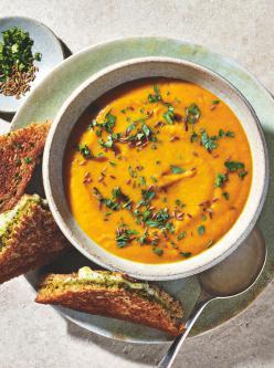 Spiced carrot & lentil soup with cheesy pesto toasties 33