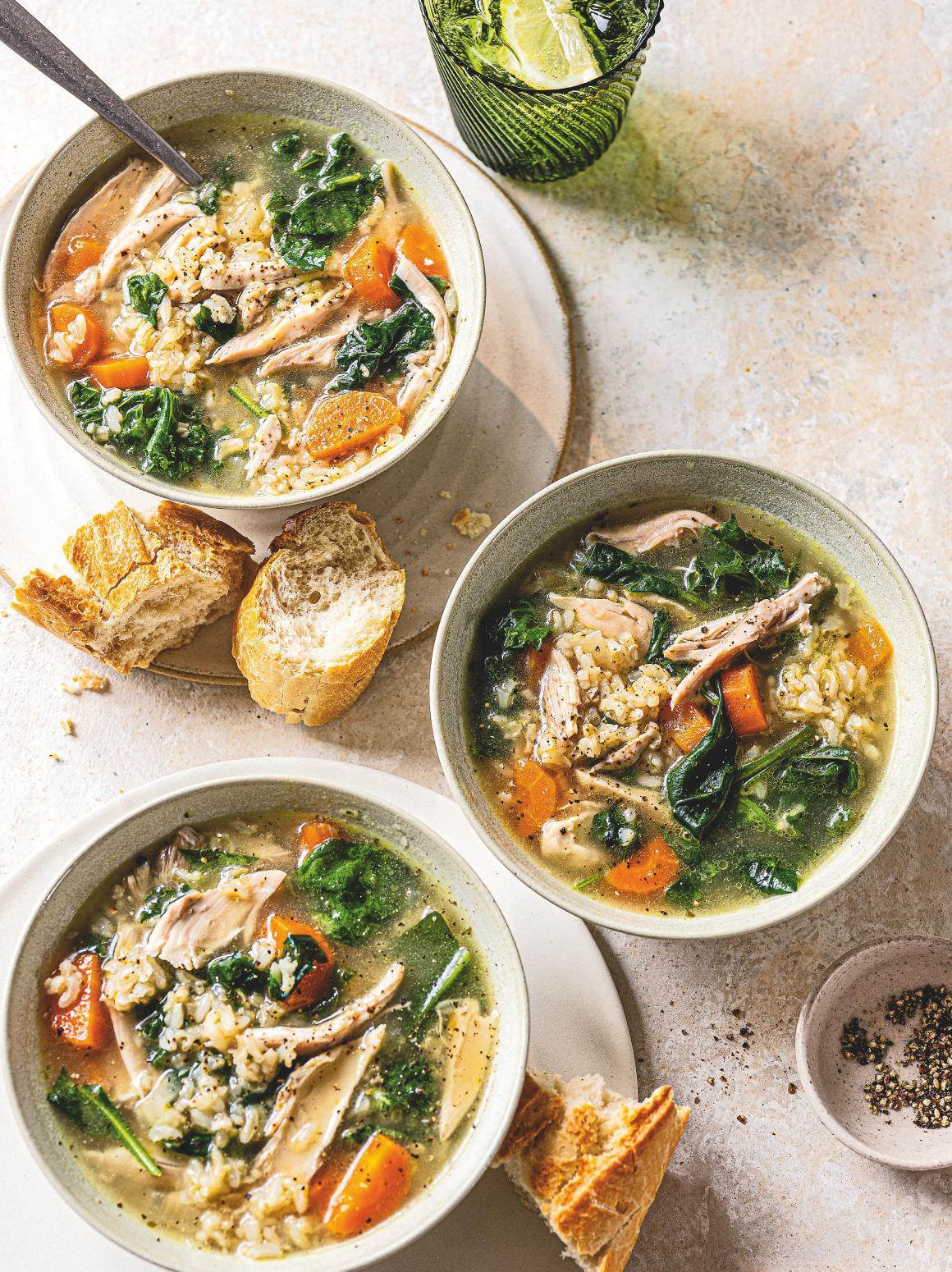 2 Remove the chicken and bay leaf to a plate and use two forks to shred the meat into bite-size pieces. Discard the bones and bay and stir the meat back into the soup with the kale and spinach. Cook over a gentle heat for 2 mins until the greens are tender. Season well with black pepper and serve with crusty bread, if you like