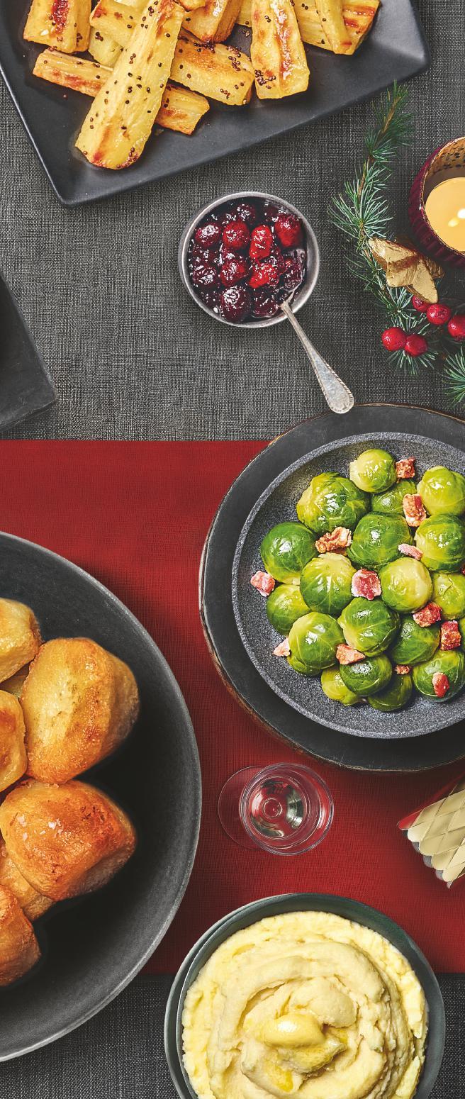 Sometimes less is more, so we suggest putting together a carefully planned menu this year with fewer - but better - components for the main event. Invest in a generous centrepiece (p10) with plenty to go around and pair it with a smaller number of luxurious sides (p22) guests can help themselves to. Readyprepared food will also free up extra time to spend with loved ones rather than being stuck in the kitchen. Easy does it!