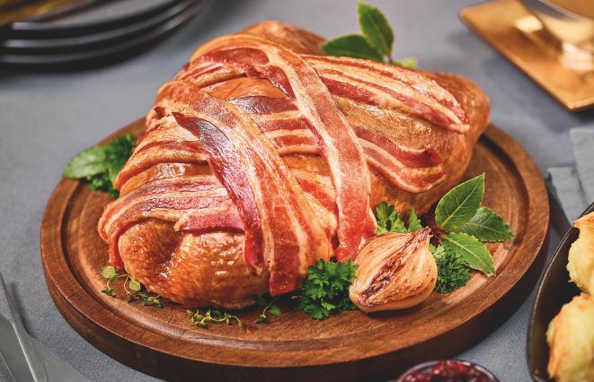 The bacon latice not only adds a smoky flavour but will also keep your turkey succulent