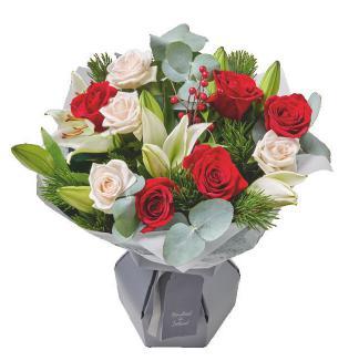 Holly berries add a touch of Christmas in this fabulous handtied bouquet of red and white roses alongside scented lilies and seasonal greenery.