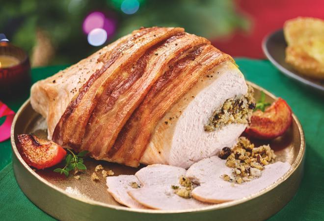 This boneless Irish turkey has been given a stuffing made with mulled fruits for a real flavour of Christmas. The skin is then covered with a layer of smoked streaky bacon to help keep the meat tender.