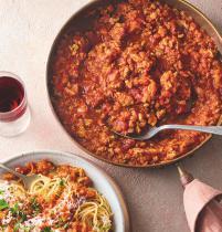 1 In a lidded frying pan, dry-fry all of the mince over a medium-high heat for 7-8 mins until browned. Reduce the heat to low, add the oil and garlic and cook for 1 min, then add the tomatoes and purée. Crumble in the stock cube, stir in 350ml water, then bring to a simmer. Cover and cook for 10 mins, then remove the lid and simmer for another 20-30 mins, adding the lentils for the last 15 mins. Add a splash of water if it starts to dry out.