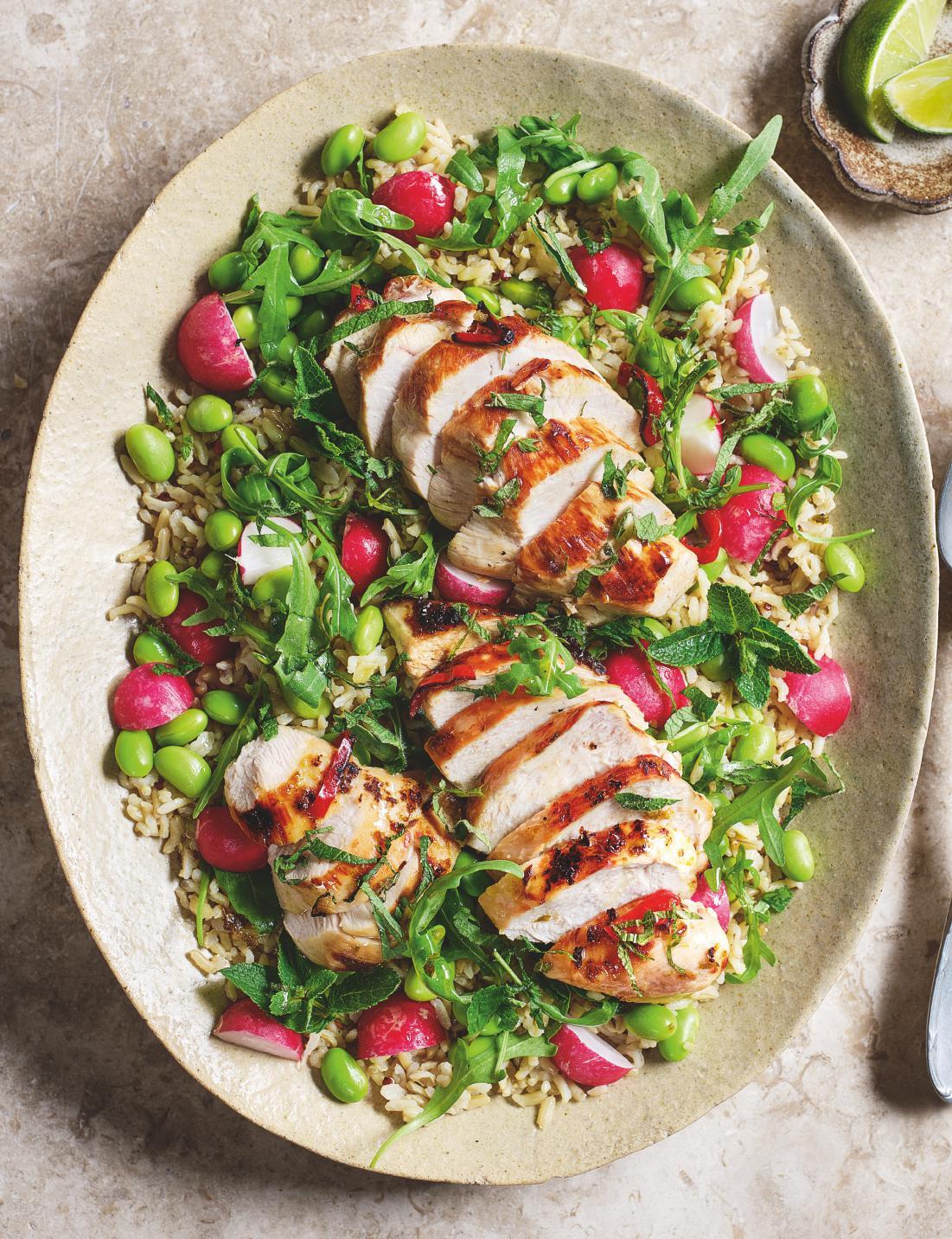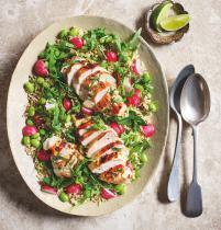 3 Meanwhile, blanch the soya beans in boiling water for 6-7 mins until tender. Heat the rice pouches to pack instructions, then add to a large bowl and leave to cool for a few mins. Add the soya beans, oil, cumin, radishes, rocket leaves and most of the mint. Season to taste, then divide the salad among plates. Slice the chicken breasts and arrange on top of the salad, spooning over any cooking juices and chillies from the tray. Scatter with the remaining mint and serve with the lime wedges for squeezing over.