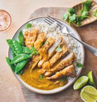 1 Make the katsu sauce: fry the onion in the oil in a lidded saucepan over a medium heat for 3-5 mins until soft. Add the ginger and cook for 1 min. Stir in the spices and carrots; cook for 5 mins. Add the flour, cook for 1 min, then stir in the coconut milk and 450ml water. Bring to a simmer, then add the squash; cover and simmer for 10 mins. Add the peppers and cook for another 12-15 mins until all the veg are soft. Stir through the soy sauce, lime zest and juice. Blitz with a stick blender until smooth, then simmer, uncovered, for a further 8-10 mins until thickened. Season to taste.