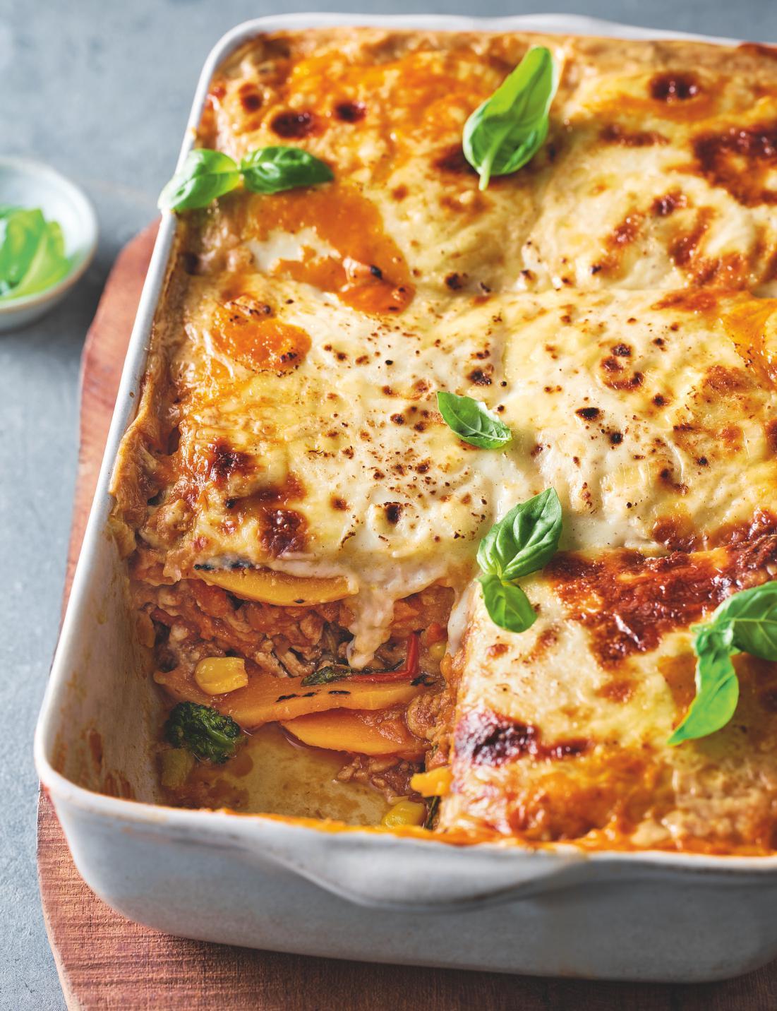 4 Stir the frozen veg and most of the basil into the sauce. Season to taste. Add ½ the sauce to a (1.5ltr) 20 x 30cm ovenproof dish, scatter over ⅓ of the cheese and layer ½ the squash on top. Add the remaining meat sauce, another ⅓ of the cheese and the remaining squash. Top with the bechamel and remaining cheese. Bake for 40-45 mins until bubbling and the squash is tender. Stand for 10 mins; scatter with the remaining basil to serve. Each serving
