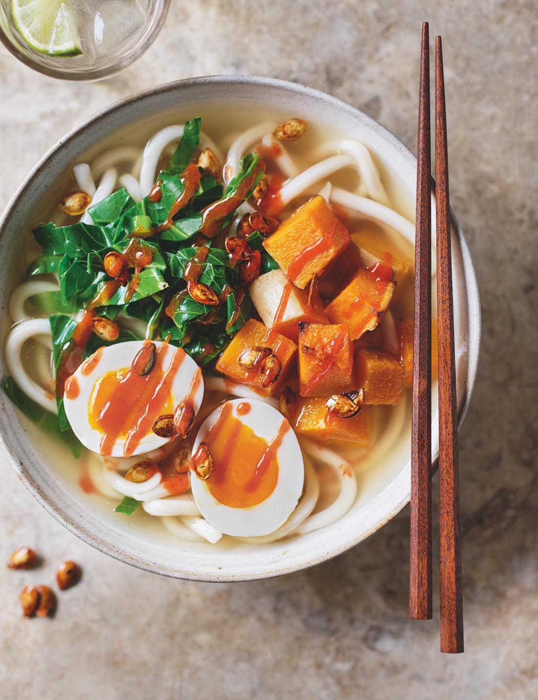 6 Serve in bowls. Top with the squash, eggs, seeds and a drizzle of sriracha, if using.