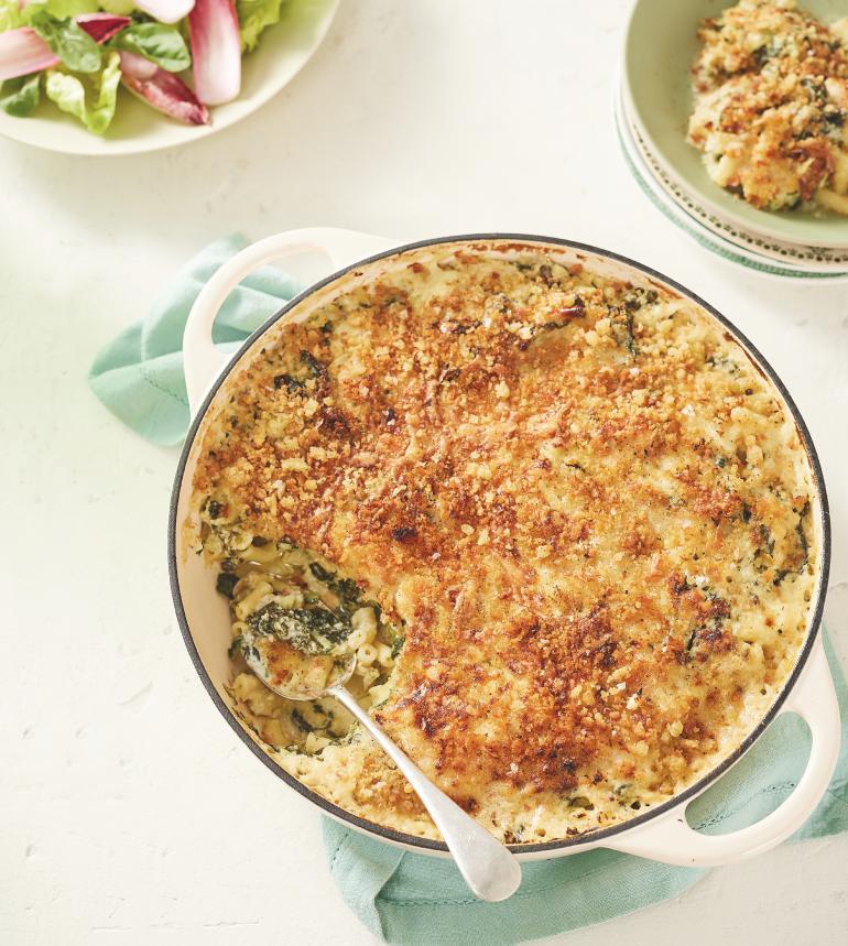 to a simmer, then stir in the mustard and grate in most of the cheese. Once it’s thickened, add the spinach and pasta with 600ml boiling water, and stir well until every piece of the pasta is coated. Bring to the boil, then simmer for 2-3 mins.