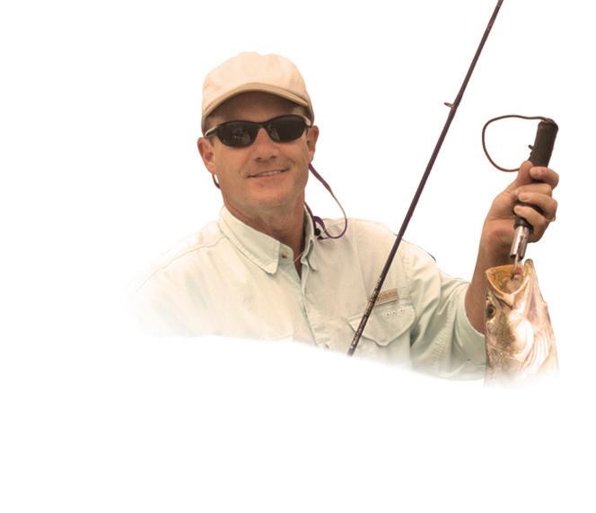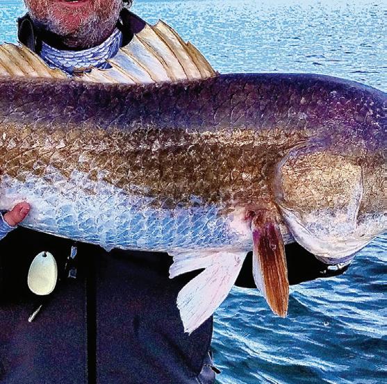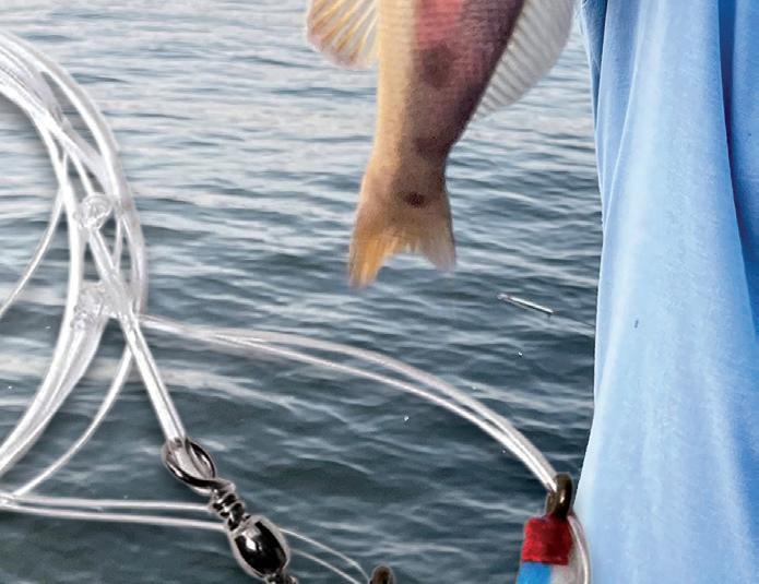 He shes small chunks of cut mullet on a Carolina (Fish Finder) rig and targets outgoing tides. “ ese sh will move up tight to the shorelines to feed on high tides. When it starts to trickle out, you can really get on a good bite. It is very common to catch sh up to 15 pounds, but most of them are in the ve to eight-pound range.”