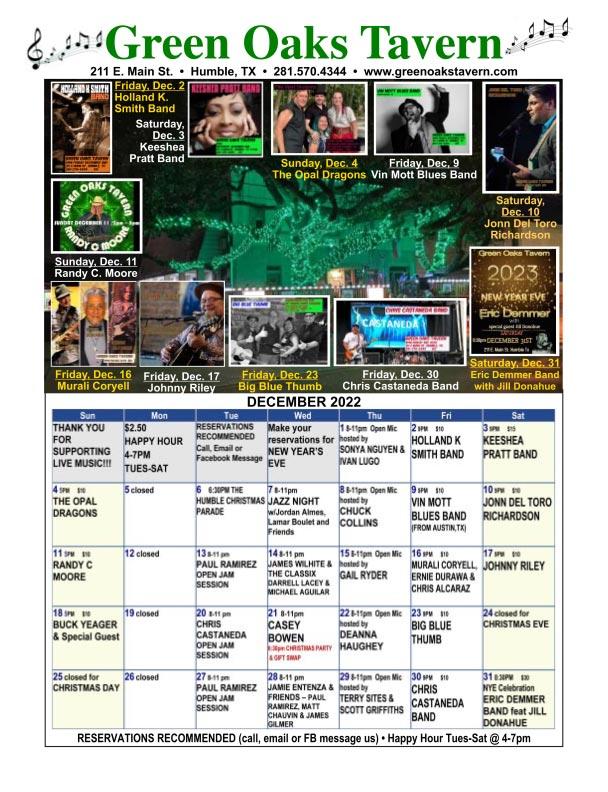 Special Events at The 19th Hole Tuesdays Karaoke Wednesdays Bingo Fridays 10 oz. Steak Lunch Special Only $13.99 DECEMBER Friday, December 2Zach of Safer Alternatives Saturday, December 3No Tin Godz Friday, December 9To Be Announced Saturday, December 10As If Freaks Weathered Friday, December 23 To Be Announced Saturday, December 24 No band for Christmas Eve Friday, December 30To Be Announced Saturday, December 31Angela Just Fan Fiction Brent’s Band Every Thursday Night Live Jam Session! All Musicians Welcome! GRILL & SPORTS BAR 202 Sawdust Rd. (The Woodlands) • 281-363-2574 • http://www.19th.cc The 19th Hole Grill & Bar is celebrating our 32nd Year Anniversary of being a live music venue DART TOURNAMENT EVERY MONDAY NIGHT!! Take I-45 to the Rayford/Sawdust exit in Spring • Go west on Rayford/Sawdust • Make a right turn at the first red light We’re at the end of the strip center on your left! @ 8:00 PM https://www.facebook.com/theHOLE19TH/ 2 Music News • December 2022