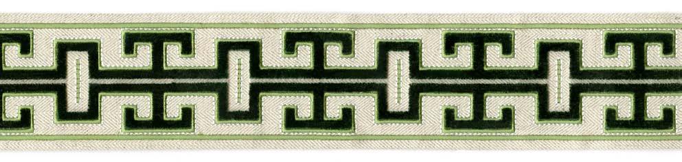 A narrow-width Greek key tape featuring vibrant colors and luxuriousness of velvet. This playful trim adds the perfect pop to any design.