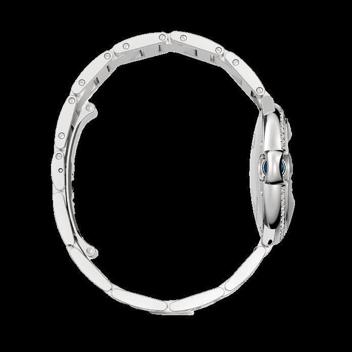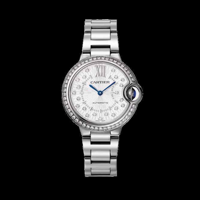 Ballon Bleu de Cartier watch, 33 mm, mechanical movement with automatic winding. Steel case, fluted steel crown set with a synthetic cabochon-shaped spinel. Steel bezel set with 50 diamonds totaling 0.57 carats. Matte silvered sunray-brushed dial set with 21 brilliant-cut diamonds totaling 0.10 carats. Blued-steel sword-shaped hands. Sapphire crystal. Interchangeable steel bracelet. Case diameter: 33 mm, thickness: 10.16 mm. Water-resistant up to 3 bar (approx. 30 meters/100 feet).