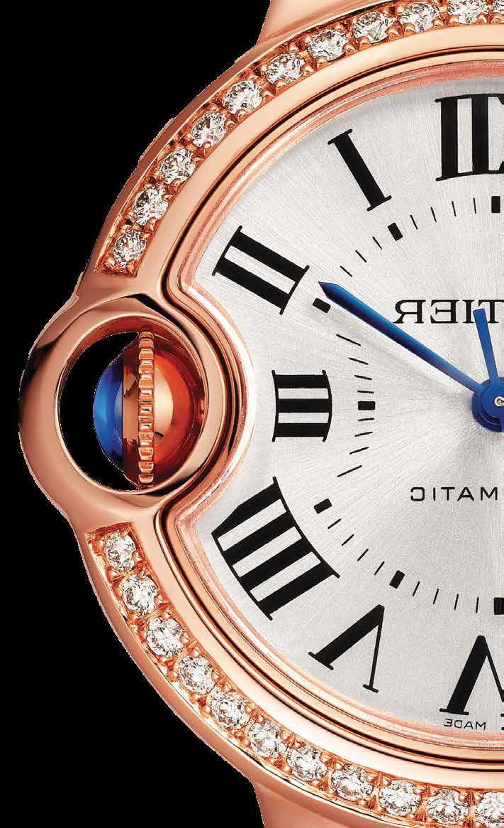 Ballon Bleu de Cartier watch, 33 mm, mechanical movement with automatic winding. 18K rose gold (750/1000) case set with brilliant-cut diamonds. Fluted crown set with a sapphire cabochon.