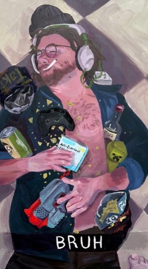 Drefahl finds inspiration for her work in mundane online scrolling. This process leads to her painting both viral images like a horse captioned “We’re so back” and a UW–Madison student passed out with a bag of Doritos.