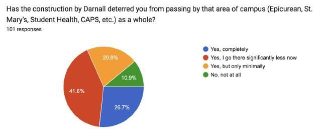 to examine the degree to which the construction has impacted student traffic in that area. A significant portion of respondents — 41.6% — stated that the construction has led them to walk in the area “significantly less,” and 26.7% of respondents replied that construction has deterred them from walking in the area altogether. Furthermore, 20.8% of respondents stated that their routes were only impacted “minimally,” while the remaining 10.9% claimed that they are unaffected.